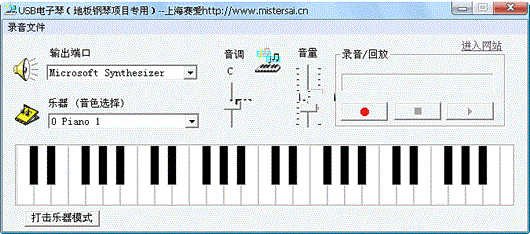 usb电子琴,可以用鼠标弹奏,可以选择输出端口,还有多种乐器音色供选择,可以调节音调和间量,可以将弹奏的曲子录音。