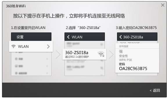 第3步:在手机上将WiFi设置打开,选择360-xxxx,输入密码连接
