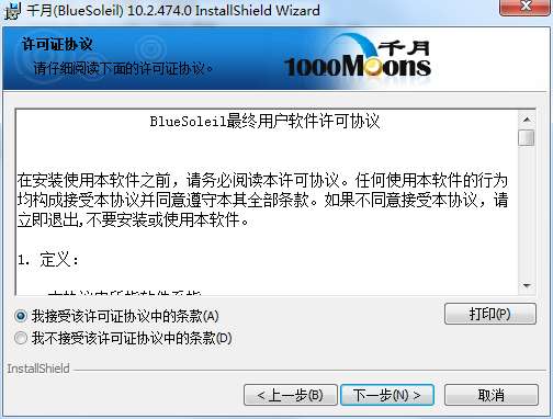 2、开始安装后会进入到千月(BlueSoleil)的许可协议界面:在这个界面我们需要先大致了解千月(BlueSoleil)的协议内容,因为你想要安装千月(BlueSoleil)软件是需要必须同意该协议。如你同意该协议选择我同意并单击【下一步】继续安装。