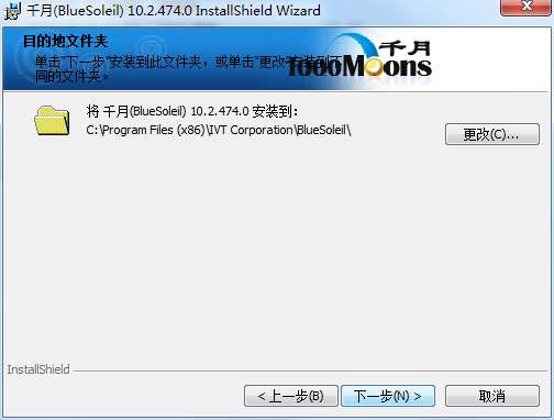 3、继续安装进入到千月(BlueSoleil)安装目录界面,在这里我们可以选择设置千月(BlueSoleil)的具体安装位置,单击【更改】即可设置。设置后单击【下一步】继续安装。