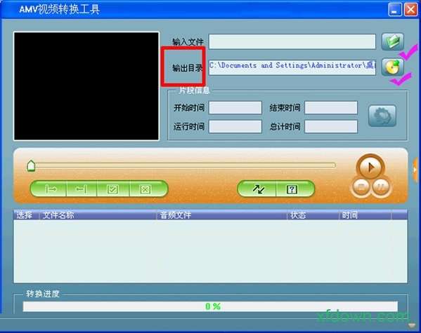 设置完成以后,点击下面的双箭头的图标,开始转换, 最下面为转换进度,转换完成后,软件自动调用amv播放助手播放,验证文件是否能正常播放。