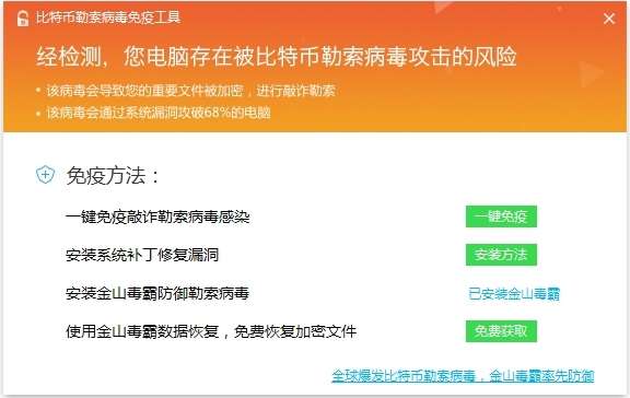 金山毒霸比特币勒索病毒免疫专用工具是一款比特币病毒专杀工具,这款比特币病毒专杀工具能够一键免疫系统敲诈病毒性感染,因而有必须的盆友赶快免费下载!