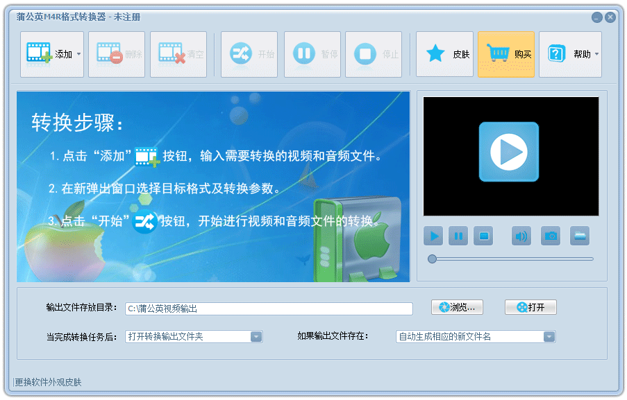 蒲公英花M4R格式转换软件是一款技术专业的的M4R音频文件格式转换软件。本软件能够 将您钟爱的歌曲文件格式转换为iPhone M4R文件格式,适用将M4R音频格式转换为各种各样常见的音频文件格式。比如将MP3, MP2, AAC, AC3, WAV, WMA, M4A, RM, RAM, OGG, AU, AIF, AIFF, APE, FLAC等音频转换为M4R音频,同样支持 AVI, WMV, VCD, DVD, VOB, MOV, MP4, 3GP, RMVB, MPEG等视频格式转换为M4R音频。