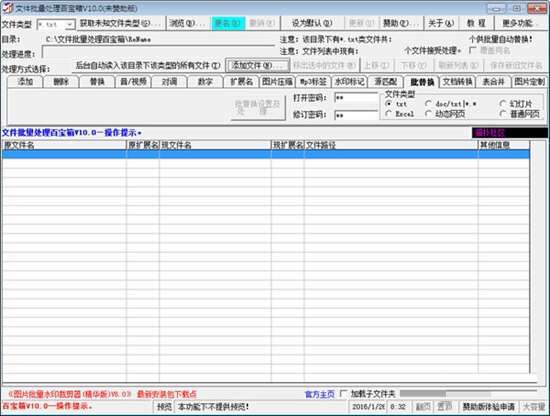 文件批量处理百宝箱最新版是一款非常专业的电脑文件批量处理软件。它的功能十分强大,可以批量添加、删除、替换、对调、数字、扩展名、水印标记、表合并、图片定制等,批量下载网络图片、批量替换文件和文件夹、批量转换图片大小和格式等。