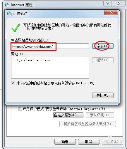 6、在空白框中输入添加信任的网址,单击“添加”按钮