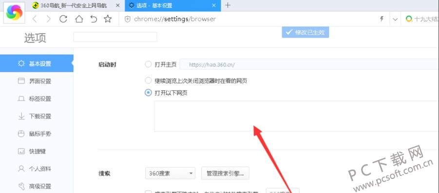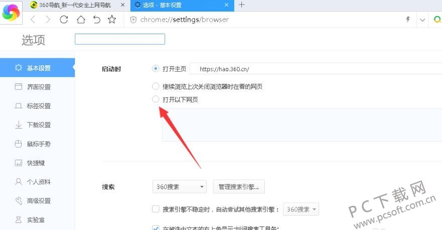 4、在打开的设置界面中,切换左侧的选项卡至基本设置。在右侧勾选“打开以下网页”。