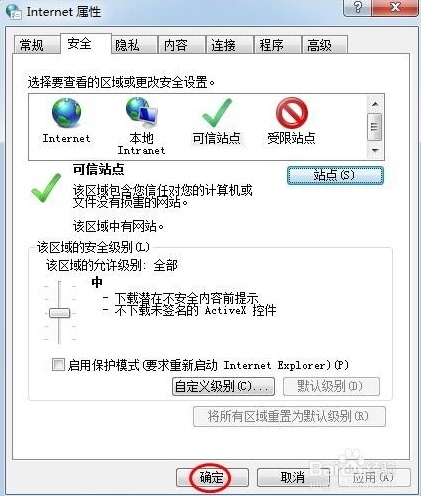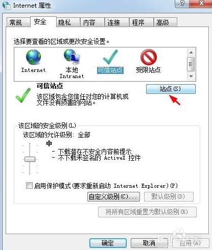 4、切换至“安全”选项卡,单击“可信站点”