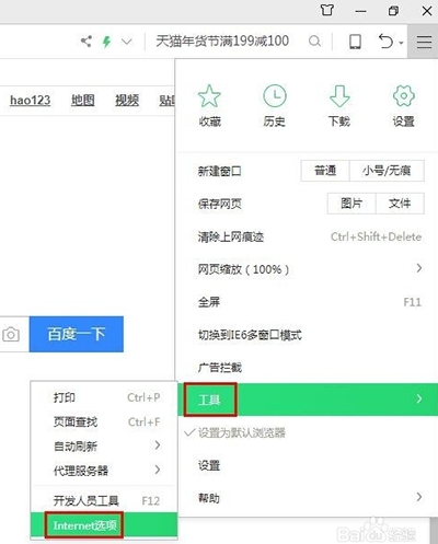 2、选择“工具”中的“Internet选项”