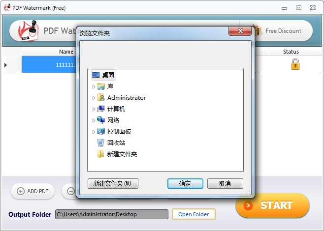 在开始添加水印之前,我们可以先设置添加水印后的PDF文档的文件输出路径。PDF Watermark会自动选择PDF文档输出路径。点击PDF Watermark主界面中的图示按钮,打开文件夹浏览窗口,选择添加水印后的PDF文档的输出路径;