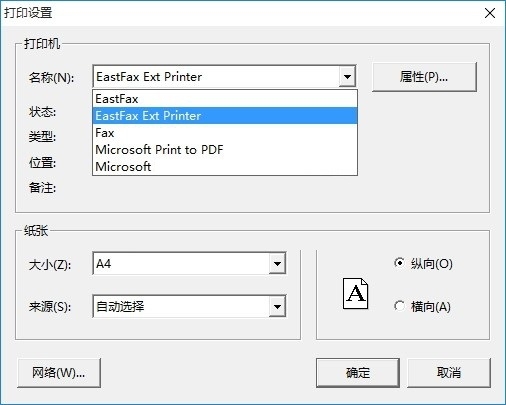 5、内置的打印机设置面板包括了多种型号的打印机,可以根据需要进行编辑,EastFax Ext,Printer EastFax,EastFax Ext Printer,Fax,Microsoft Print to pdf,Microsoft Xps Document Writer