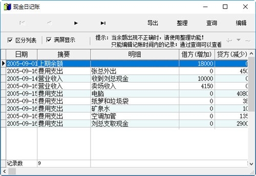 现金日记帐管理系统是一套专门记录当天现金收付业务的管理系统。能够随时知道余额,操作简单、实用、即学即会。强大的数据统计和查询功能,非常适用没有财务软件的中小型企业使用,也适合个体经销部及家庭使用。