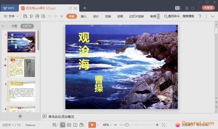 观沧海ppt课件为你全面解析篇诗词中所表述的内容,让同学们领略曹操的胸怀大志。课件的内容是比较多的,而且其中的讲解都是比较细致的。课件比较多,欢迎来体验!