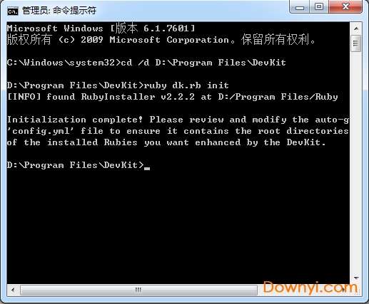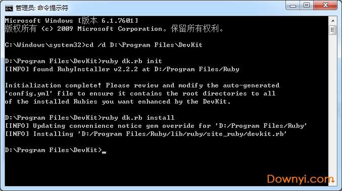 4.继续输入“ruby dk.rb install”,安装enter键,出现下图消息,表示安装完毕。