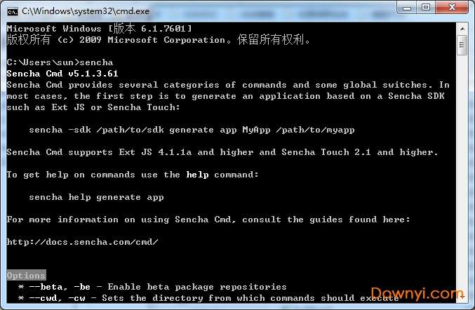 安装完成后,打开dos命令框,输入:sencha