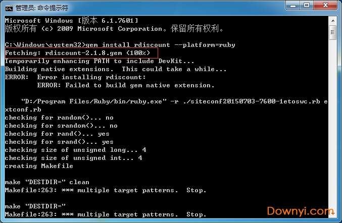 5.打开dos输入:gem install rdiscount --platform=ruby,如果能够安装rdiscount成功说明安装devkit。