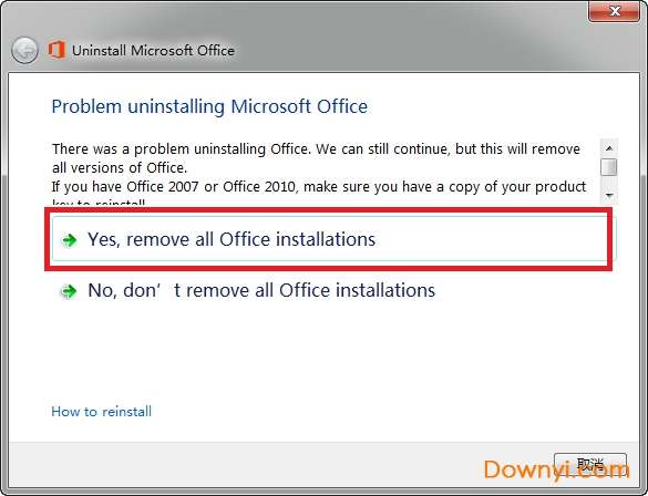 3.检测到存在多个版本的office问题,点击"yes"卸载当前当前电脑所有office版本;点击"no"不卸载所有office版本,这里根据自身选择,我选择了"yes"