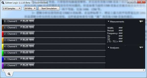 单击“开始”按钮开始记录逻辑分析仪中的数据,让软件在分析数据之前完成处理数据。 请注意,如果您没有将逻辑分析仪插入计算机,则该按钮将改为开始模拟,它将使用模拟数据并允许您在连接硬件之前学习软件。