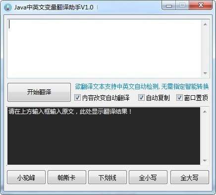 Java中英文变量翻译助手官方版是一款非常专业的Java翻译工具。Java中英文变量翻译助手最新版可用于日常中英互译、数据库、数据表、字段等命名转换,用户在日常使用时只需要在上方输入框输入原文,下方即会显示翻译结果。Java中英文变量翻译助手官方版还支持中英文自动检测,让用户能够更加方便的编写Java。