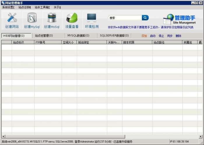 1.一键添加IIS站点、FTP帐号、建网站目录、开Mysql数据库.可选支持asp,php,asp.net等脚本,各站点独立权限。