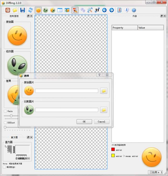 2、而后点击DiffImg界面上的open按钮(文件夹图标)。在弹出界面中,找到两张图片并点击ok。