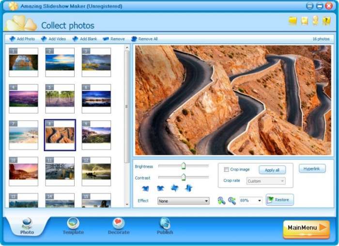 您可以在4个步骤中制作幻灯片。步骤1加载照片/视频文件。您可以编辑照片和视频文件,如调整亮度/对比度、旋转照片、裁剪图像/视频、添加效果(灰色、逆向、雕塑)和添加超链接;步骤2选择模板。您可以下载更多的模板。它允许您从本地计算机添加音乐文件。第三步装饰你的幻灯片。您可以向照片/视频中添加文本/裁剪部分/自定义剪辑部分/声音,并为每个添加的照片/视频文件选择转换;步骤4将幻灯片发布为不同的文件格式。您可以在其界面上预览幻灯片,也可以在转换之前在浏览中预览它。