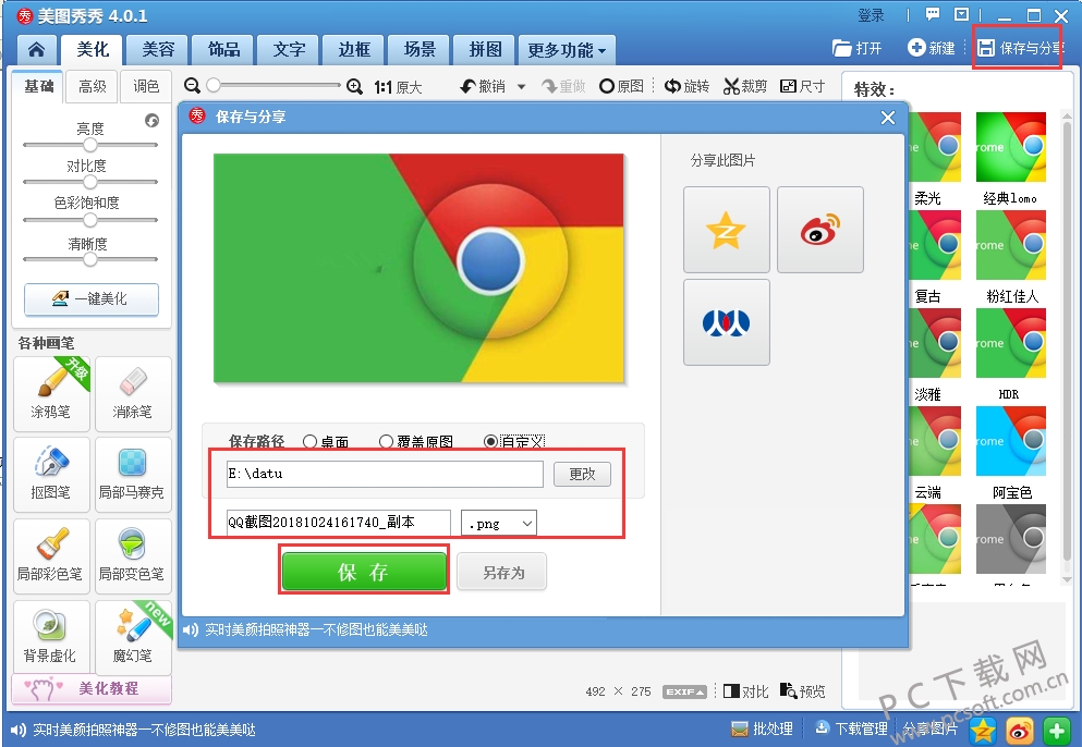 5.在美图秀秀界面的右上角的点击保存分享按钮,就可以保存了,当然用户也可以使用快捷键Ctrl+s进行保存的。设置好保存的位置后将照片保存。然后你就可以在保存的的位置找到替换背景色的照片了。