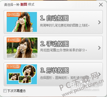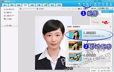 1.在PC下载网下载安装号美图秀秀软件后,在桌面上会出现美图秀秀的快捷方式图标,双击快捷方法打开美图秀秀软件,然后将要换底色的照片导进来,单击右上角的“抠图”并选择“自动抠图”功能