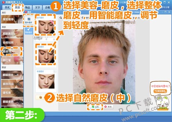 2、接下来再点击美容分类下的磨皮选项,有整体磨皮和局部磨皮两种方式,我们需要选择整体磨皮,然后在整体磨皮下还有着自然磨皮、智能磨皮、快速磨皮和自然磨皮。我们先选择智能磨皮,然后调节为轻度,完成后再选择自然磨皮,调节为中度,等待磨皮完成。