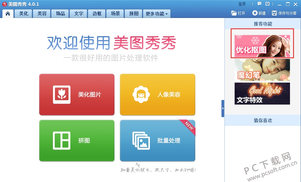 2、导入完成之后,我们在软件主界面的右侧推荐功能下方有个优化抠图选项,点击后我们可以进入抠图界面。或者我们先点击界面的美化选项,然后在左侧分类下找到抠图笔选项并点击,也可以进入抠图界面。