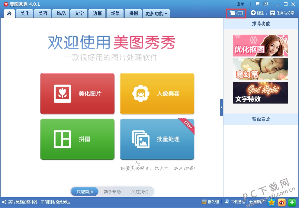 1、首先我们在电脑上安装美图秀秀软件后,找到桌面的快捷方式双击打开,进入美图秀秀秀主界面,在右上角点击打开选项,然后将要去除水印的图片导入到软件中。