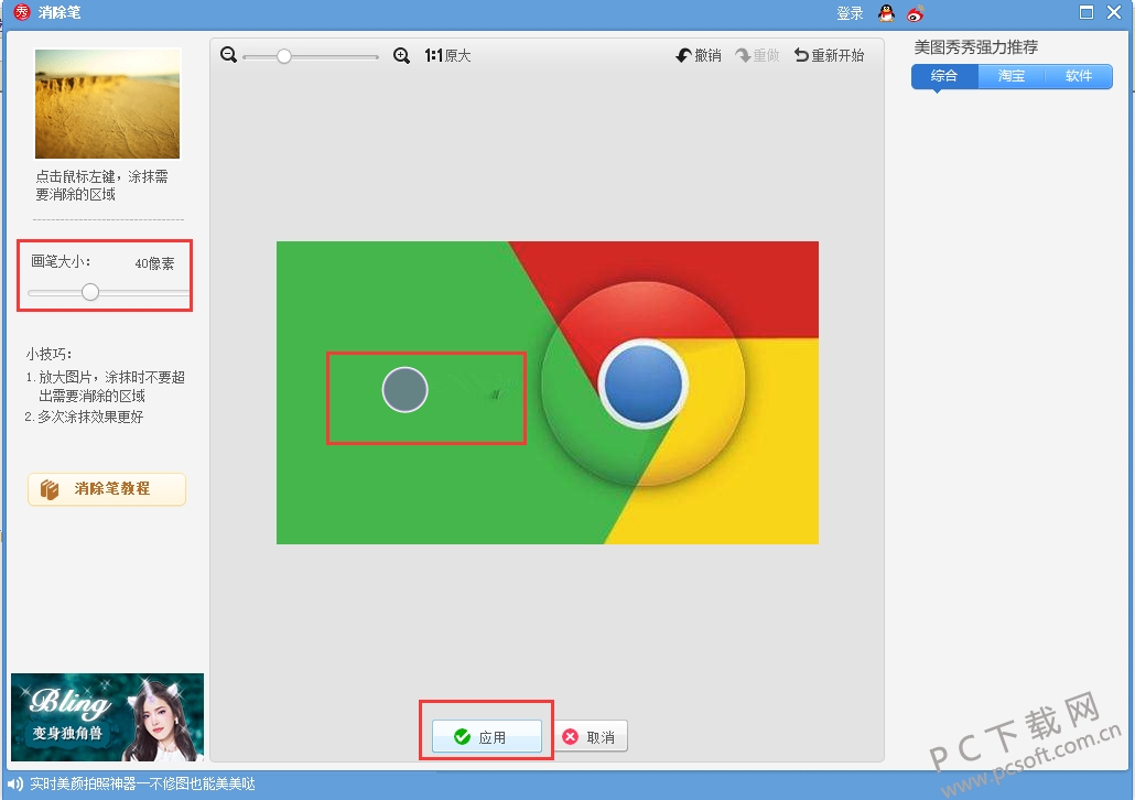 3、点击消除笔后进入新的界面,我们现在界面左侧选择消除笔的大小,如果水印较小可以将画笔调小一些,水印较大也可以将画笔调大,画笔调完后,我们对图中的水印进行涂抹,涂抹后软件会自动进行处理,等待处理完成后看图片的水印是否被消除,还有残留的话对残留处继续涂抹,直到被软件消除,然后点击下方的应用,完成后就意味着水印已经被消除。