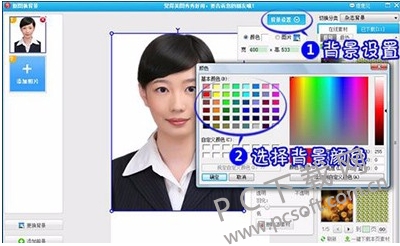 3.单击“完成抠图”后,我们就可以开始替换照片的背景颜色了。首先我们先点击界面右上角的“背景设置”选项,在弹出的界面中选择背景的颜色以及背景的大小,如下图中我们可以看到颜色也有很多种,用户需要什么背景色点击相应的颜色后再点击界面下方的确定按钮。