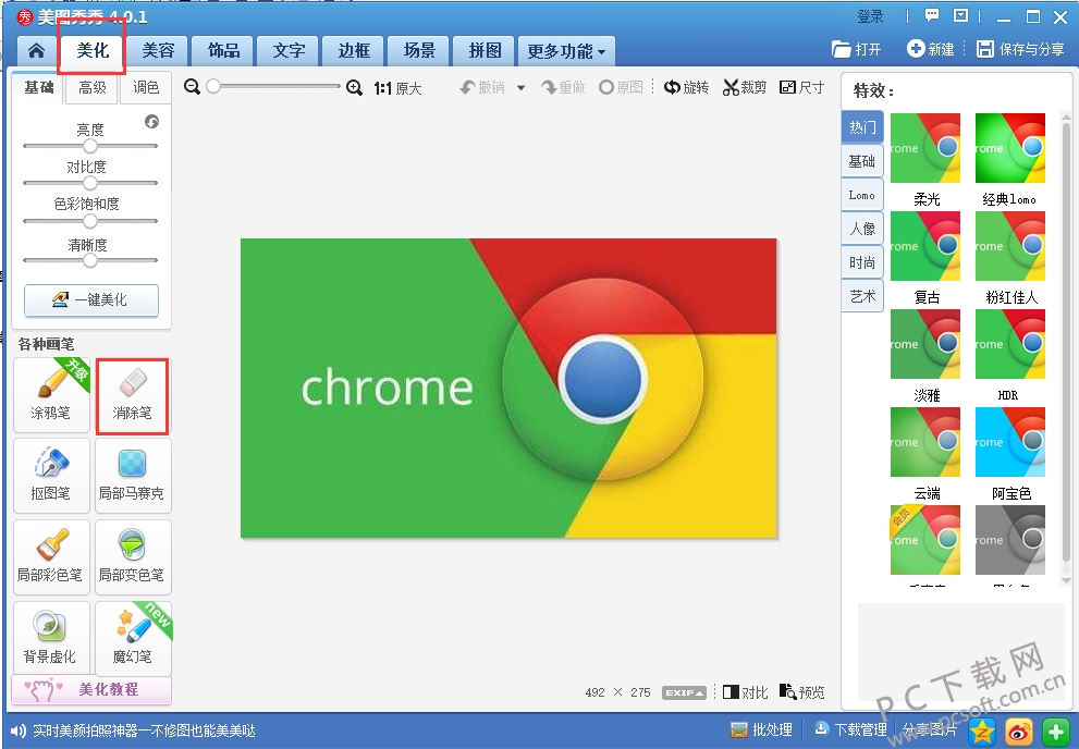 2、将去水印的照片添到软件后,点击软件界面的美化选项,然后在美化下方的分类中可以看到有很多功能选项,涂鸦笔、消除笔、抠图笔、局部马赛克等等,我们选择消除笔点击。