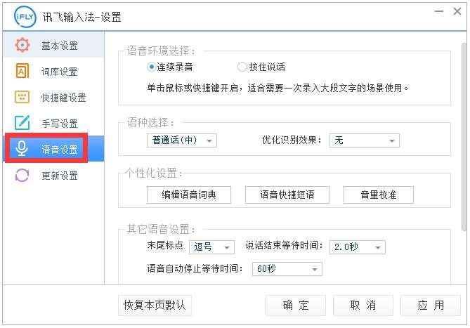 讯飞输入法PC版根据具体的使用环境设置了安静和嘈杂两种语音输入模式,默认视为嘈杂模式。