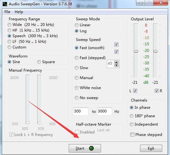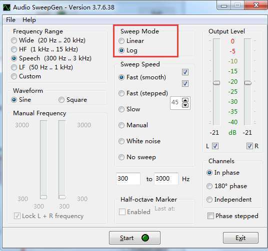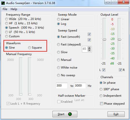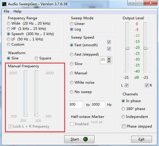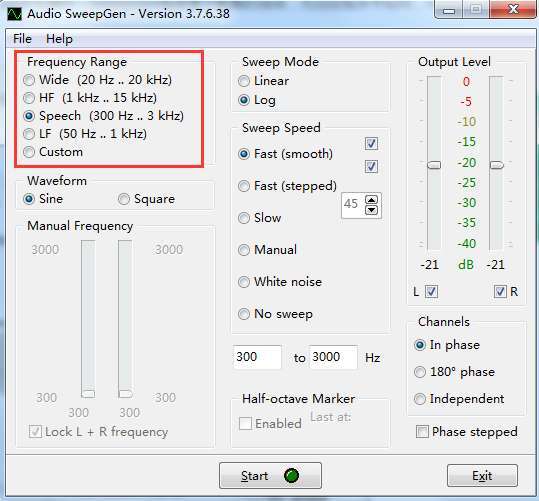 2、频率范围,支持宽(20Hz..20KHz)、高频(1KHz..15KHz)、语音(300Hz..3KHz)、低频(50HZ..1KHz)等预设,您也可以选择自定义。
