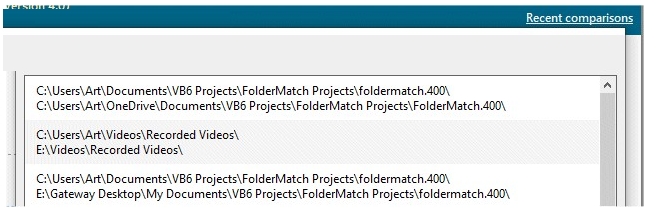 要选择一对先前比较的文件夹,请单击标题上的“最近比较”链接以打开“最近文件夹比较”窗口。选择包含所需文件夹对的最近比较。