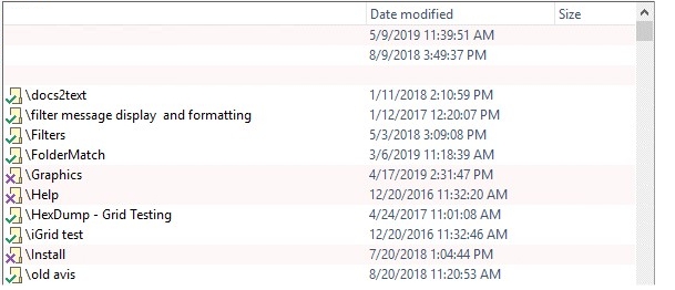 比较两个文件夹之后,FolderMatch在比较结果窗格中列出每个文件夹的内容。 出现在两侧(具有相同名称)的项目在两个窗格中并排对齐。 项目名称及其每个项目的修改日期和大小(仅文件)在三列中显示在一行中。