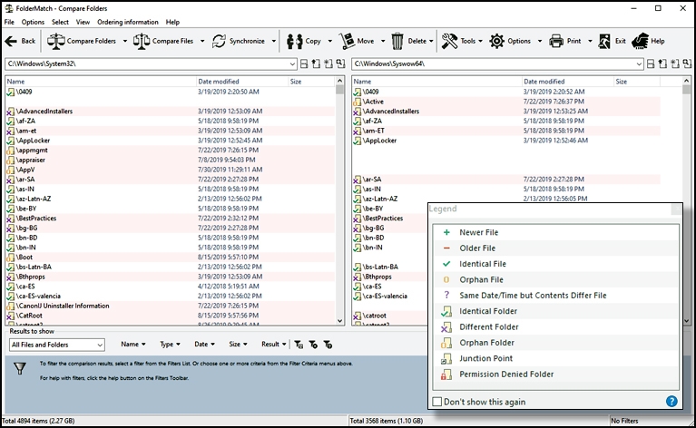 2.项目名称左侧的图像代表比较结果。 常见的比较结果图像是较新的文件,较旧的文件,相同的文件,孤立的文件,相同的日期/时间但内容不同的文件,不同的文件夹,相同的文件夹或孤立的文件夹。 您可以使用“图例”窗口来解释比较结果图像的含义。