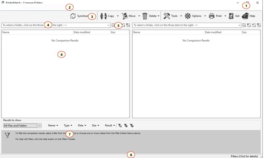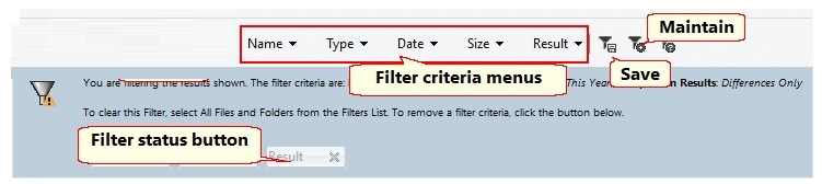 当FolderMatch比较两个文件夹时,其默认行为是列出所有文件和子文件夹。 但是您可能只想看一部分结果。 当您将“要显示的结果”过滤器应用于比较结果时,它将隐藏一些结果。 过滤器包含一个或多个过滤条件,例如文件名,文件类型,上次修改日期,文件大小和比较结果。