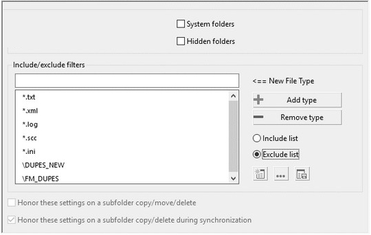 如果要让程序从比较/同步中排除(忽略)系统文件或文件夹,或隐藏文件或文件夹,请使用以下四个选项。