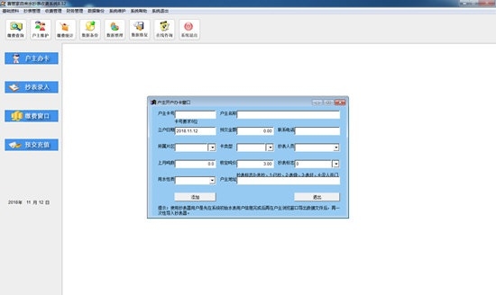 1、用户办卡:输入户主开户信息,使用抄表器用户是先在系统初始水表用户信息完成后,再在户主浏览窗口导出数据文件后,再一次性导入抄表器。