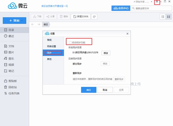 打开腾讯微云网盘界面,点击右上角的“设置”选项,在“同步”选项中勾选“启动同步功能”即可。