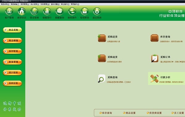 中顶手机销售管理系统最新版是一款手机行业销售管理软件。中顶手机销售管理系统最新版包含了采购进货、采购退货、采购订单、进退货查询、付款分析、商品销售、销售退货、销售换货、商品报损、商品报溢、库存报警等主要功能。中顶手机销售管理系统可以随时备份销售数据,防止数据丢失。