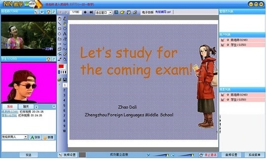 NN一对一教学软件正式版是款针对学生们所打造的远程学习工具。NN一对一教学软件最新版可以帮助老师、学生在电脑上实现远程教学功能,为不同地区的学生开启网络教学共享模式,让你可以及时与名师互动,提高自己的教育等级。NN一对一教学软件内置电子白板,可以将您所录入的信息传送给学生,学生也可以通过软件来控制老师的电脑,而且支持文档共享和视频对话。