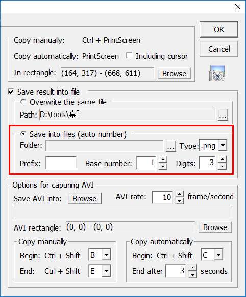 8、也可以选择第二种模式,保存到文件中(自动编号),在软件设置类型png,设置编号首字母