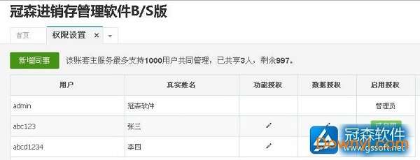 软件在权限管理极其灵活,配置方便,控制出色。软件支持自定义角色,支持权限的细分,点击冠森仓库管理软件上面的菜单“系统设置→操作员管理”,即可进入操作员管理的界面(如下图所示):