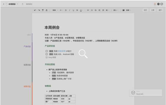 在本周会议文档中梳理目标和工作任务,使用@提及需要支持的同事,以便在会后跟踪各项行动。团队目标和关键事件都能被统一地联系在一起,执行起来可以相互支持。