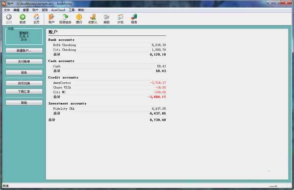AceMoney这是一款财务管理软件。可以快速、简便地组织管理个人财务,满足家庭用户甚至中小企业的会计需求。支持管理多个不同的账号,追踪投资信息,多种货币换算,在线银行,定期备份和其它多项不需要任何经验的会计经验的安全措施。