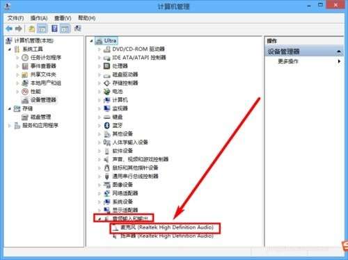 根据步骤依次选择打开:启动运行(win+R)——输入compmgmt.msc后回车——找到计算机管理——设备管理器——音频输入和输出,找到该处后检查是否有图中所示选项。有表明硬件设备——麦克风没有问题,如果没有表示当前设备不具备录制功能。