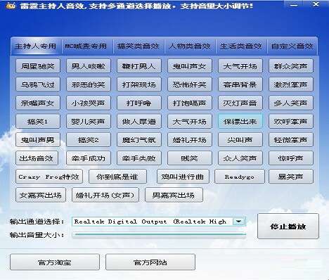 雷霆主持人音效软件是一款免费的音效播放软件,软件包括两百多种音效,包括主持人专用、MC喊麦专用、搞笑类音频、人物类音效、生活类音频等等,还可以添加自定义音效。
